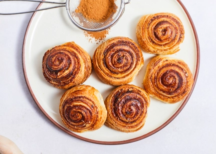 Veidotas gliemezīša formā, pildījumā kanēlis ar cukuru