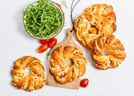 Pīrādziņu gaļa (cūkgaļa, cūku vaigi, dekstroze, stabilizētāji E450, E451, E407, biezinātāji E407a, E412, E415, E425, rauga ekstrakts, aromatizētāji, antioksidants E301, kviešu šķiedras, pārveidota ciete, maltodekstrīns, augu olbaltumvielas, dabīgi aromatizētāji, garšvielu ekstrakti (ķiploki, koriandrs, sīpoli), kūpināšanas aromatizētājs, konservants nātrija nitrīts, dzīvnieku olbaltumvielas), kviešu milti, margarīns (palmu eļļa SG, rapšu eļļa, emulgatori E471, E475, saulespuķu lecitīns, skābuma regulētājs citronskābe, dabīgs aromatizētājs, krāsviela karotīns), sīpoli, cukurs, rapšu eļļa, olu masa, raugs, ķirbju biezenis, sūkalu pulveris, sāls, garšvielu maisījums (burkānu granulas, pastinaks, sīpolu granulas, kartupeļu ciete, pētersīļi, sīpolu pulveris, maurloki, kurkuma, kurkumīns), melnie pipari, rudzu milti, antioksidants askorbīnskābe