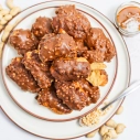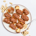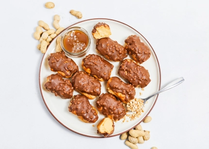 Plaucētās mīklas kūciņas, pildījumā sāļās karameles/saldā krējuma krēms, pārklāti ar karameļu glazūru un zemesriekstiem.