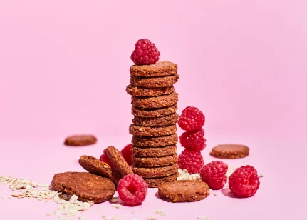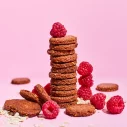 Bezglutēna auzu pārslas (28%), augu eļļas (kokosriekstu, rapšu), rīsu milti, olas, cukurniedru cukurs, aveņu deserta pasta (5%)(cukurs, aveņu mīkstums bez sēklām (40%), plūškoka koncentrāts, dabīgs aromatizētājs), bezglutēna auzu milti (3%), mandeļu milti, kaltēti aveņu gabaliņi (2.5%), tapiokas ciete, ceļteku sēklu sēnalu pulveris, inulīns, rozmarīna ekstrakts, irdinātājs cepamā soda, sāls