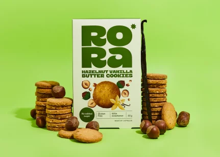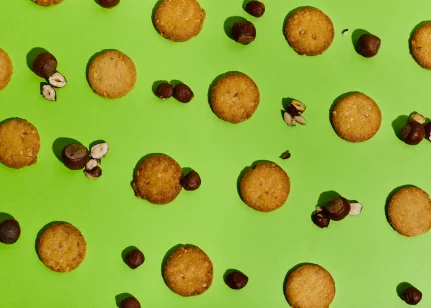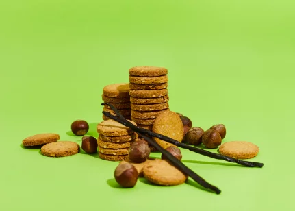 Tapiokas ciete, bezlaktozes sviests (20 %), olas, lazdu riekstu gabaliņi (10%), rīsu milti, saldinātājs maltīts (7%), kukurūzas milti, mandeļu milti, turku zirņu milti, ceļteku sēklu sēnalu pulveris, dabīgs vaniļas aromatizētājs, irdinātājs cepamā soda, antioksidants rozmarīna ekstrakts