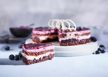 Šokolādes biskvīts, melleņu krēms, mellenes