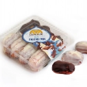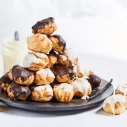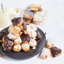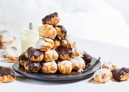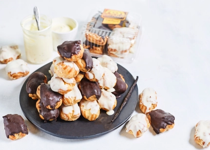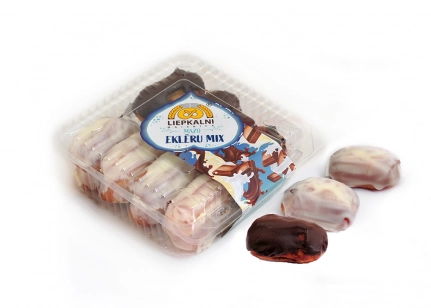 Iepakojumā kārtoti mazie eklēri, pārklāti ar balto šokolādi un mazie eklēri, pārklāti ar brūno šokolādi.