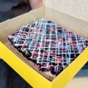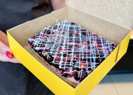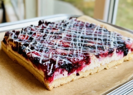 Ogu maisījums (28 %) (jāņogas, upenes, kazenes, zemenes, avenes), biezpiens (26 %), kviešu milti, cukurs, margarīns (augu tauki (palmu eļļa), augu eļļa (rapšu eļļa), emulgatori E471, saulespuķu lecitīns, skābuma regulētājs citronskābe, krāsviela beta karotīns), pūdercukurs, olu masa, biezpiena piedeva (modificētā ciete E1414, olbaltuma pulveris, skābuma regulētājs citronskābe, aromatizētāji citronu un vaniļas), recinātājs pārveidota ciete, šokolādes glazūra (palmu tauki, rapšu eļļa, vājpiena pulveris, glikozes sīrups, kakao sviests, emulgatori E472a, saulespuķu lecitīns, aromatizētājs), želeja (skābuma regulētāji E331, citronskābe, E340, recinātāji E407, pektīns, biezinātāji E410, E414, glikoze, karamele, aromatizētāji), cepamais pulveris (irdinātāji E450, dzeramā soda), sāls