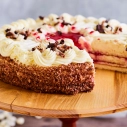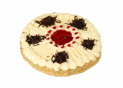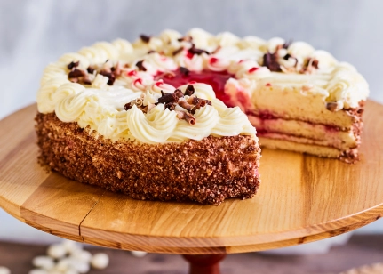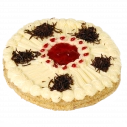 Krēms (piens, krēma maisījums (cukurs, pārveidota ciete, sūkalu pulveris, palmu tauki, glikozes sīrups, piena tauki, emulgators E472b, vājpiena pulveris, piena olbaltumvielas, biezinātājs E407, stabilizētājs E450, sāls, burkānu ekstrakts, aromatizētājs, safloras koncentrāts), iebiezinātais piens, saldais krējums), biskvīts (olas, cukurs, kviešu milti, kartupeļu ciete), aveņu pildījums (svaigas avenes, cukurs), šokolādes dekori (pilnpiena pulveris, kakao sviests, kakao masa, emulgators saulespuķu lecitīns)