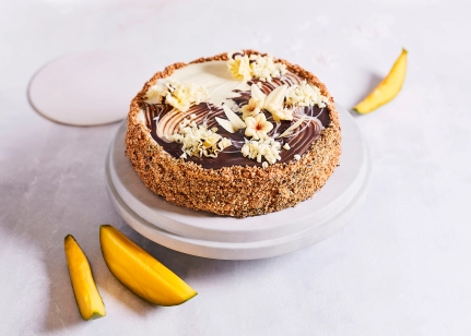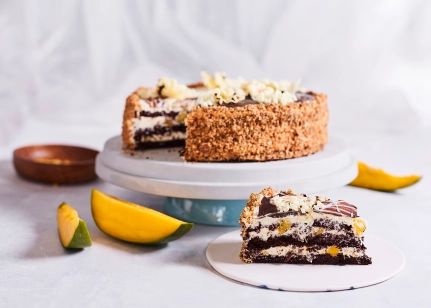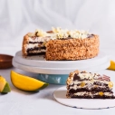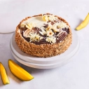 Mango pildījums (mango, cukurs, glikozes – fruktozes sīrups, pārveidota ciete, citronu sula, biezinātājs E418), saldais krējums, olas, šokolādes glazūra (palmu tauki, rapšu eļļa, vājpiena pulveris, glikozes sīrups, kakao sviests, emulgatori E472a, saulespuķu lecitīns, aromatizētājs, kakao pulveris, emulgators sojas lecitīns), cukurs, kviešu milti, kakao pulveris, cukura dekori (cukurs, glikozes sīrups, kviešu ciete, augu eļļa, augu tauki, dekstroze, emulgatori E472c, E473, krāsviela E171, biezinātājs E415, vaniļas aromatizētājs), šokolādes dekori (kakao sviests, vājpiena pulveris, sviesta eļļa, emulgators sojas lecitīns, aromatizētājs, krāsvielas E101, E120, E171, pilnpiena pulveris, laktoze), kartupeļu ciete, pārtikas krāsvielas E120, E100