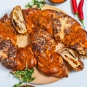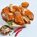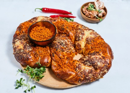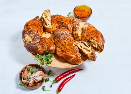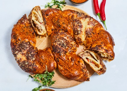 Kviešu milti, kūpināts vistas giross (vistas gaļa, dekstroze, ķiploki, garšvielas, skābuma regulētājs etiķskābe, stabilizētāji E407, E450, garšas pastiprinātājs E621, augu olbaltumvielas (kukurūza, rapsis), konservanti nātrija nitrīts, E262, antioksidants E316, garšvielu ekstrakts, biezinātāji E415, E425), siers (piens, kalcija hlorīds, pienskābo baktēriju tīrkultūra, pārtikas krāsviela beta karotīns, kukurūzas ciete), marinēti šampinjoni, margarīns (augu tauki (palmu), rapšu eļļa, emulgatori E471, saulespuķu lecitīns, sāls, skābuma regulētājs citronskābe, dabīgs aromatizētājs, krāsviela beta karotīns), marinēta paprika (paprika, etiķis, stabilizētājs E509, saldinātājs saharīns), cepti sīpoli, majonēze (rapšu eļļa, olu pulveris un olu masa, vājpiena pulveris, cukurs, sāls, skābuma regulētāji etiķskābe, citronskābe, dzeramā soda, konservants kālija sorbāts, sinepju sēklu aromatizētājs, krāsviela beta karotīns), tomātu kraukšķis (tomātu pasta, siers, saulespuķu eļļa, Provansas garšvielas, dabīgs antioksidants rozmarīna ekstrakts), cukurs, rapšu eļļa, olu masa, raugs, ķirbju biezenis, sūkalu pulveris, želeja (cukurs, skābuma regulētāji citronskābe, E331, E340, recinātāji karagināns, pektīns, biezinātāji E410, E414, dekstroze, karamelizēts cukurs, aromatizētājs), sāls, antioksidants askorbīnskābe, melnie pipari