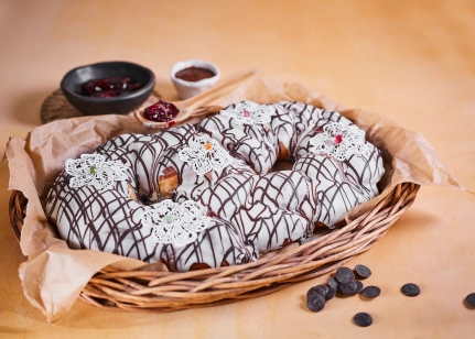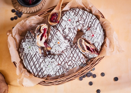 Bagātīgs ķiršu pildījums un šokolādes pildījums.