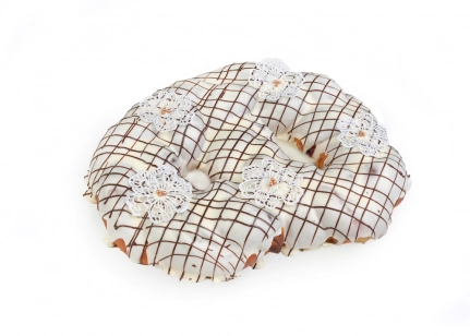 Kāzu un kristību kliņģeris, pārklāts ar balto šokolādi, virsmu grezno elegants mežģīnes raksts