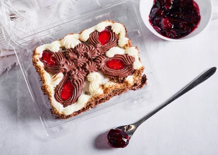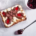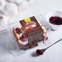 Krēms (piens, maisījums (pārveidota ciete, sūkalu pulveris, palmu tauki, glikozes sīrups, piena tauki, emulgators E472b, vājpiena pulveris, piena olbaltumvielas, biezinātājs karagināns, stabilizētājs difosfāts, burkānu ekstrakts, aromatizētājs, safloras koncentrāts), iebiezinātais piens, saldais krējums, kakao pulveris), biskvīts (olas, cukurs, kviešu milti, kartupeļu ciete), ķiršu pildījums (ķirši, cukurs, pārveidota ciete), dzērveņu ievārījums ((dzērvenes, glikozes un fruktozes sīrups, ūdens, biezinātājs pektīns, skābuma regulētājs citronskābe)