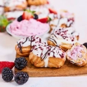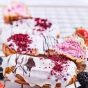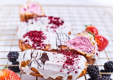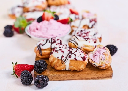 Ogu pildījums (43 %)(ogu maisījums (33 %) (ogu maisījums (jāņogas, zemenes, kazenes, avenes, ķirši, upenes), saldais krējums, mascarpones siers, cukurs), plaucētā mīkla (olu masa, kviešu milti, margarīns (augu tauki (palmu eļļa), augu eļļa (rapšu eļļa), emulgatori E471, saulespuķu lecitīns, skābuma regulētājs citronskābe, krāsviela beta karotīns), sāls), šokolādes glazūra (19 %)(cukurs, augu tauki (palmu), rapšu eļļa, vājpiena pulveris, kaltēts glikozes sīrups, kakao sviests, emulgatori E472a, saulespuķu lecitīns, aromatizētājs, augu tauki (šī), kakao pulveris, emulgators sojas lecitīns), ķirši saldējot žāvēti