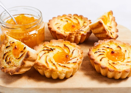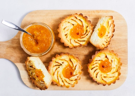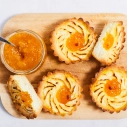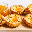 Smilšu mīklas groziņš ar biezpiena aprikožu pildījumu. Biezpienu izmantojam no vietējiem ražotājiem, un tas izceļas ar savu graudainumu un mājās gatavota biezpiena garšu.