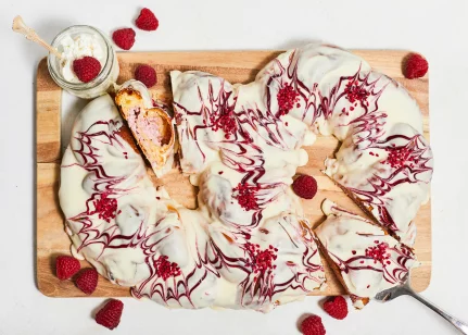 Biezpiena-aveņu kliņģeris ir kā maiguma un mīlestības pilns kopābūšanas brīdis. Maigais biezpiena un sulīgs aveņu pildījums saplūst vienā harmoniskā garšā, kas raisa apbrīnu un prieku. Virsma rotāta ar elegantu gaišās šokolādes pārklājumu ar košām aveņu glazūras stīdziņām, kas piešķir kliņģerim svētku noskaņu un smalku mīlestības pieskārienu.