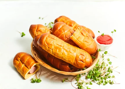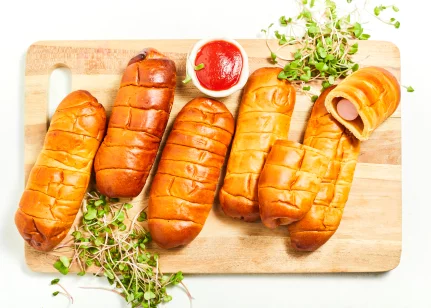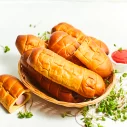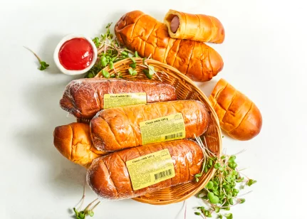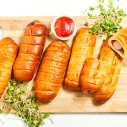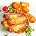 Cīsiņš (48 %)(cūkgaļa, vistas gaļa, cūku speķis, piena olbaltumvielas, olu masa, sāls, kartupeļu ciete, stabilizētāji E450, E451, glikozes sīrups, antioksidants askorbīnskābe, aromatizētājs, rauga ekstrakts, garšvielu ekstrakti (čilli, melnie pipari, kardamons), skābuma regulētājs citronskābe, konservants nātrija nitrīts), kviešu milti, cukurs, rapšu eļļa, olu masa, raugs, ķirbju biezenis, margarīns (augu tauki (palmu eļļa), augu eļļa (rapšu eļļa), emulgatori E471, saulespuķu lecitīns, skābuma regulētājs citronskābe, krāsviela beta karotīns), sūkalu pulveris, sāls, rudzu milti