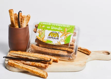 Kviešu milti, margarīns (augu tauki (palmu eļļa), augu eļļa (rapšu eļļa), emulgatori E471, saulespuķu lecitīns, skābuma regulētājs citronskābe, dabīgs aromatizētājs, krāsviela beta karotīns), cukurs, olu masa, rudzu klijas (3 %), sāls, vaniļas cukurs (0.2 %)(cukurs, kartupeļu ciete, 3.8 % vaniļas aromatizētājs (vanilīns un vaniļa)), skābuma regulētājs citronskābe