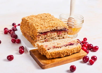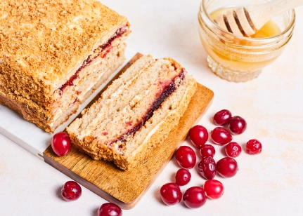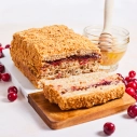 Bezlaktozes kefīrs (piens, pienskābo baktēriju ieraugs, bifido baktērijas, ferments), olas, bezglutēna miltu maisījums (bezglutēna kviešu ciete, lupīnu milti, kukurūzas ciete, linsēklu milti, biezinātājs guāra milti, cukurs, emulgators saulespuķu lecitīns, cepamais pulveris (irdinātāji E450, dzeramā soda), sāls), dzērveņu ievārījums (dzērvenes, glikozes – fruktozes sīrups, biezinātājs pektīns), bezlaktozes saldais krējums (pasterizēts saldais krējums, ferments), cukurs, medus (8.5%), augu tauku maisījums (augu eļļas (kokosriekstu, rapšu), ūdens), kartupeļu ciete, mandeļu milti, kanēlis, rozmarīna ekstrakts, cepamais pulveris (irdinātāji E450i, dzeramā soda, kartupeļu ciete), biezinātājs ksantāna sveķi