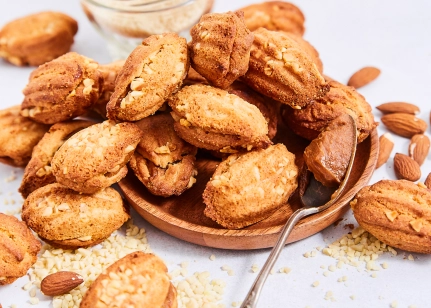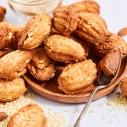 Pildījums (cukurs, vājpiena pulveris, palmu eļļa, biezinātājs kukurūzas ciete, stabilizētāji E401, E509, citrusaugļu šķiedrvielas), bezglutēna miltu maisījums (bezglutēna kviešu ciete, lupīnu milti, kukurūzas ciete, linsēklu milti, biezinātājs guāra milti, cukurs, emulgators saulespuķu lecitīns, cepamais pulveris (irdinātāji E450, dzeramā soda), sāls), augu tauku maisījums (augu eļļas (kokosriekstu, rapšu), ūdens), cukurs, olas, mandeļu gabaliņi (5 %), mandeļu milti (4%), cukura sīrups, biezinātājs ksantāna sveķi, rozmarīna ekstrakts