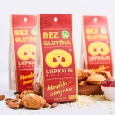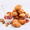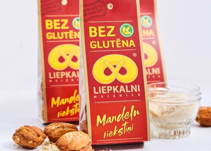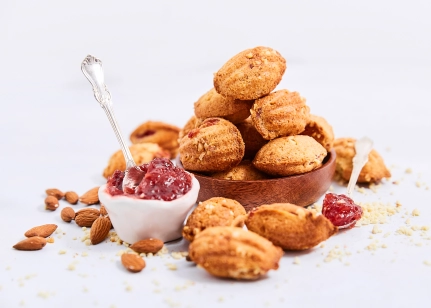 Bezglutēna miltu maisījums (bezglutēna kviešu ciete, lupīnu milti, kukurūzas ciete, linsēklu milti, biezinātājs guāra milti, cukurs, emulgators saulespuķu lecitīns, cepamais pulveris (irdinātāji E450, dzeramā soda), sāls), augu tauku maisījums (augu eļļas (kokosriekstu, rapšu), ūdens), zemeņu pildījums (17%)(cukurs, zemenes, glikozes – fruktozes sīrups, pārveidota ciete, skābuma regulētājs citronskābe, recinātājs pektīns, biezinātājs E460, dabīgs aromatizētājs, krāsviela E163), cukurs, olas, mandeļu milti (5%), mandeļu gabaliņi (5%), cukura sīrups, pārveidota kartupeļu ciete, biezinātājs ksantāna sveķi, kartupeļu šķiedra, rozmarīna ekstrakts