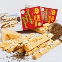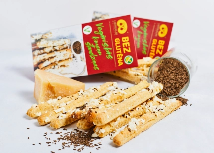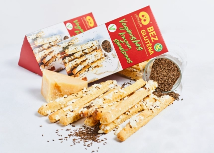 Bezglutēna miltu maisījums (bezglutēna kviešu ciete, lupīnu milti, kukurūzas ciete, linsēklu milti, biezinātājs guāra milti, cukurs, emulgators saulespuķu lecitīns, cepamais pulveris (irdinātāji E450, dzeramā soda), sāls), margarīns (palmu tauki, rapšu eļļa, emulgatori E471, saulespuķu lecitīns, sāls, skābuma regulētājs citronskābe, dabīgs aromatizētājs, krāsviela beta karotīns), vegānu siers (19 %)(kokosa tauki, pārveidota kartupeļu ciete, aromatizētājs vegānu, B12 vitamīns), ķimenes (1.8 %), augu tauku maisījums (augu eļļas (kokosriekstu, rapšu), ūdens), sāls, linsēklu milti, skābuma regulētājs citronskābe
