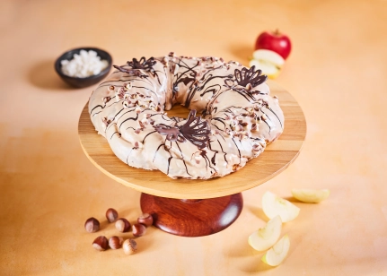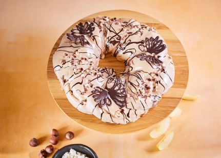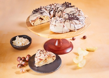 Kviešu milti, trifeļu riekstu – šokolādes glazūra (augu tauki (palmu, šī sviests), lazdu rieksti, vājpiena pulveris, emulgators sojas lecitīns, vanilīns, kakao pulveris), biezpiens (13 %), āboli (12 %), iebiezinātā piena produkts (12 %)(cukurs, vājpiena pulveris, palmu tauki), olu masa, cukurs, šokolādes dekori (kakao sviests, pilnpiena pulveris, kakao masa, laktoze, emulgators sojas lecitīns, dabīgs vaniļas aromatizētājs, krāsviela E101), rapšu eļļa, biezpiena piedeva (pārveidota ciete, olbaltuma pulveris, skābuma regulētājs citronskābe, aromatizētāji citronu un vaniļas), raugs, margarīns (augu tauki (palmu eļļa), augu eļļas (rapšu), emulgatori E471, saulespuķu lecitīns, skābuma regulētājs citronskābe, dabīgs aromatizētājs, krāsviela beta karotīns), ķirbju biezenis, sūkalu pulveris, sāls