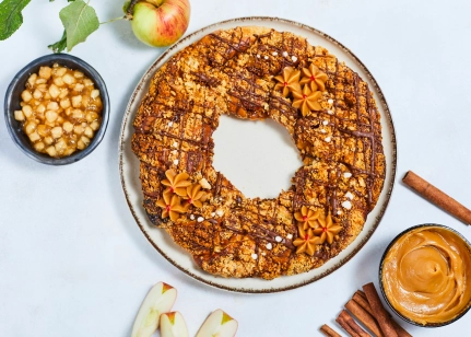Karameļu pildījums (23%)(glikozes – fruktozes sīrups, cukurs, vājpiena pulveris, palmu un basijas kauliņu eļļa, pārveidota ciete, biezinātājs pektīns, karamelizēts cukurs sīrups, sāls), kviešu milti, ābolu pildījums (17 %)(āboli, dabīgs aromatizētājs, recinātājs želena sveķi, skābe citronskābe, kanēlis), vaniļas krēms (sūkalu pulveris, kokosa eļļa, stabilizētāji E450ii, E339ii, E516, biezinātājs E401, krāsviela beta karotīns, aromatizētājs), cukurs, margarīns (augu eļļas (rapšu, palmu), sāls, emulgatori rapšu lecitīns, E471, skābuma regulētājs citronskābe), olu masa, griljāža (glikozes sīrups, dekstroze, medus pulveris, maltodekstrīni, sviesta eļļa), karameļu glazūra (saulespuķu eļļa, karameļu pulveris (sūkalas, sviests, piena pulveris, kakao pulveris, emulgatori E492, sojas lecitīns, krāsviela paprikas ekstrakts), rapšu eļļa, raugs, ķirbju biezenis, šokolādes glazūra (glikozes sīrups, kakao sviests, emulgatori E472a, saulespuķu lecitīns), sūkalu pulveris, kanēlis, sāls, antioksidants askorbīnskābe