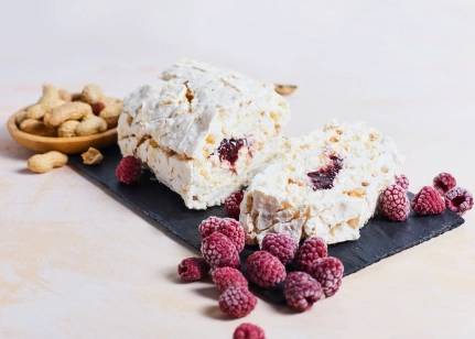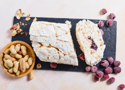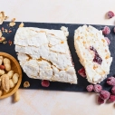 Maigu un gaisīga kā pūka bezē rulete ar ķiršiem un zemesriekstiem.