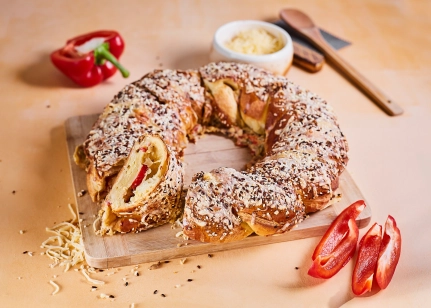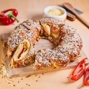 Kviešu milti, siers (piens, kalcija hlorīds, baktēriju tīrkultūra, pārtikas krāsviela annato), pīrādziņu gaļa (cūkgaļa, cūku vaigi, sāls, garšvielas, dekstroze, antioksidants E316, biezinātājs E407, stabilizētāji E450, E451), margarīns (augu tauki (palmu eļļa), augu eļļas (rapšu), emulgatori E471, saulespuķu lecitīns, skābuma regulētājs citronskābe, aromatizētājs, krāsviela beta karotīns), marinēti gurķi (etiķis, garšvielas (dilles, sīpoli, sinepju un piparu graudiņi, saldinātājs saharīns,dabīgais aromatizētājs), konservēta paprika (ar saldinātāju) (sarkanā paprika, etiķis, sāls, glikozes sīrups, stabilizētājs E509, saldinātājs saharīns), majonēze (rapšu eļļa, olu dzeltenuma pulveris, skābuma regulētāji etiķskābe, pienskābe, sinepju eļļa, antioksidants E385), cukurs, rapšu eļļa, ķiploki, olu masa, raugs, ķirbju biezenis, sūkalu pulveris, sāls, rudzu milti, melnie pipari, garšvielu maisījums (kaltēti dārzeņi (burkāni, kurkuma, dilles, pētersīļi, sīpoli, paprika sarkanā)
