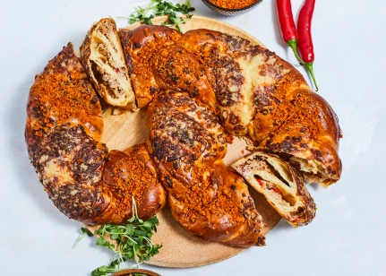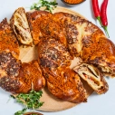 Kviešu milti, kūpināts vistas giross (vistas gaļa, dekstroze, ķiploki, garšvielas, skābuma regulētājs etiķskābe, stabilizētāji E407, E450, garšas pastiprinātājs E621, augu olbaltumvielas (kukurūza, rapsis), konservanti nātrija nitrīts, E262, antioksidants E316, garšvielu ekstrakts, biezinātāji E415, E425), siers (piens, kalcija hlorīds, pienskābo baktēriju tīrkultūra, pārtikas krāsviela beta karotīns, kukurūzas ciete), marinēti šampinjoni, margarīns (augu tauki (palmu), rapšu eļļa, emulgatori E471, saulespuķu lecitīns, sāls, skābuma regulētājs citronskābe, dabīgs aromatizētājs, krāsviela beta karotīns), marinēta paprika (paprika, etiķis, stabilizētājs E509, saldinātājs saharīns), cepti sīpoli, majonēze (rapšu eļļa, olu pulveris un olu masa, vājpiena pulveris, cukurs, sāls, skābuma regulētāji etiķskābe, citronskābe, dzeramā soda, konservants kālija sorbāts, sinepju sēklu aromatizētājs, krāsviela beta karotīns), tomātu kraukšķis (tomātu pasta, siers, saulespuķu eļļa, Provansas garšvielas, dabīgs antioksidants rozmarīna ekstrakts), cukurs, rapšu eļļa, olu masa, raugs, ķirbju biezenis, sūkalu pulveris, želeja (cukurs, skābuma regulētāji citronskābe, E331, E340, recinātāji karagināns, pektīns, biezinātāji E410, E414, dekstroze, karamelizēts cukurs, aromatizētājs), sāls, antioksidants askorbīnskābe, melnie pipari
