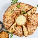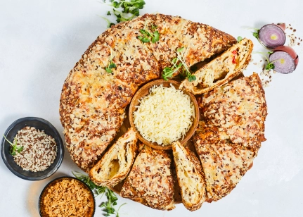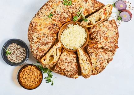 Kviešu milti, siers (piens, kalcija hlorīds, pienskābo baktēriju tīrkultūra, pārtikas krāsviela beta karotīns, kukurūzas ciete), sēklu maisījums (saulespuķu sēklas, linsēklas, sezama sēklas), margarīns (augu tauki (palmu), rapšu eļļa, emulgatori E471, saulespuķu lecitīns, sāls, skābuma regulētājs citronskābe, dabīgs aromatizētājs, krāsviela beta karotīns), marinēti šampinjoni, fetas siers (piens, mikrobioloģiskais ferments, pienskābo baktēriju tīrkultūra), majonēze (rapšu eļļa, olu pulveris un olu masa, vājpiena pulveris, cukurs, sāls, skābuma regulētāji etiķskābe, citronskābe, dzeramā soda, konservants kālija sorbāts, sinepju sēklu aromatizētājs, krāsviela beta karotīns), Mozzarella siers, cepti sīpoli, marinēta paprika (paprika, etiķis, stabilizētājs E509, saldinātājs saharīns), olu masa, cukurs, rapšu eļļa, raugs, ķirbju biezenis, sīpoli, sūkalu pulveris, sāls, antioksidants askorbīnskābe, melnie pipari