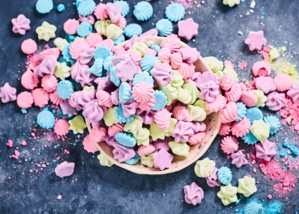 Sastāvdaļas: Cukurs, olbaltuma piedeva (olu baltuma pulveris, biezinātāji E466, E412, stabilizētājs E1505), aveņu deserta pasta (2 %)(avenes, cukurs, aļģu ekstrakts, maltodekstrīns), augļu sarkanā krāsviela (pārtikas krāsviela karmīns), skābuma regulētājs citronskābe
