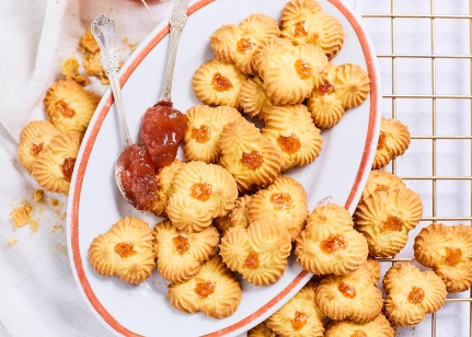 Mutē kūstoši smilšu mīklas cepumi ziediņu formā.
