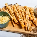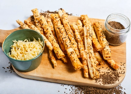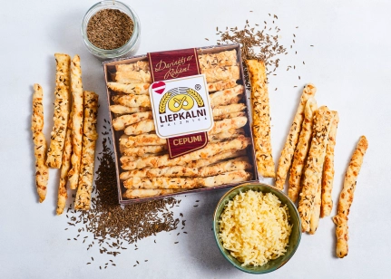 Kviešu milti, margarīns (augu tauki (palmu eļļa), augu eļļa (rapšu eļļa), emulgatori E471, saulespuķu lecitīns, skābuma regulētājs citronskābe, krāsviela beta karotīns), siers (21 %)(piens, kalcija hlorīds, baktēriju tīrkultūra, pārtikas krāsviela annato), olu masa, ķimenes (0.9 %), sāls, paprikas pulveris, skābuma regulētājs citronskābe