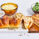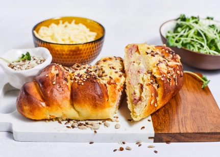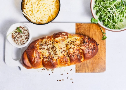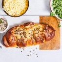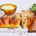 Kviešu milti, siers (piens, kalcija hlorīds, baktēriju tīrkultūra, ferments, vārāmā sāls, pārtikas krāsviela annato), desa p/ž (cūkgaļa, cūku speķis, kartupeļu ciete, sāls, konservants nātrija nitrīts, skābuma regulētājs E575, garšvielas (t.sk. selerija, melnie pipari, baltie pipari, ķiploks), dekstroze, antioksidants E316, stabilizētājs E450, garšas pastiprinātājs E621, krāsviela karmīns), majonēze (rapšu eļļa, olu dzeltenuma pulveris, skābuma regulētāji etiķskābe, pienskābe, sinepju eļļa, antioksidants E385), cukurs, rapšu eļļa, olu masa, sēklu maisījums (sezama sēklas, linsēklas, saulespuķu sēklas), margarīns (augu eļļas (rapšu, palmu), sāls, emulgatori rapšu lecitīns, E471, skābuma regulētājs citronskābe, dabīgs aromatizētājs, krāsviela beta karotīns), ķirbju biezenis, raugs, garšvielu maisījums (kaltēti dārzeņi (burkāni, kurkuma, dilles, pētersīļi, sīpoli, paprika sarkanā), sūkalu pulveris, sāls