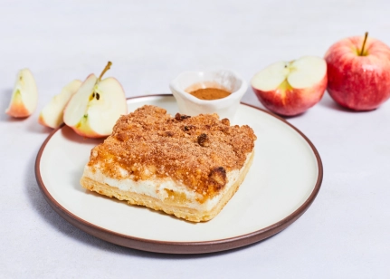 Ābolu – kanēļa pildījums (33%)((žāvēti āboli, glikozes – fruktozes sīrups, pārveidota ciete, dabīgs aromatizētājs, recinātājs E418, skābe citronskābe, kanēlis 0.08%, antioksidants askorbīnskābe), biezpiens (21%), kviešu milti, margarīns (augu tauki (palmu eļļa), augu eļļas (rapšu), emulgatori E471, saulespuķu lecitīns, skābuma regulētājs citronskābe, dabīgs aromatizētājs, krāsviela beta karotīns), cukurs, olu masa, biezpiena piedeva (modificētā ciete E1414, olbaltuma pulveris, skābuma regulētājs citronskābe, aromatizētāji citronu un vaniļas), pūdercukurs, kanēlis, cepamais pulveris (irdinātāji E450, dzeramā soda), sāls