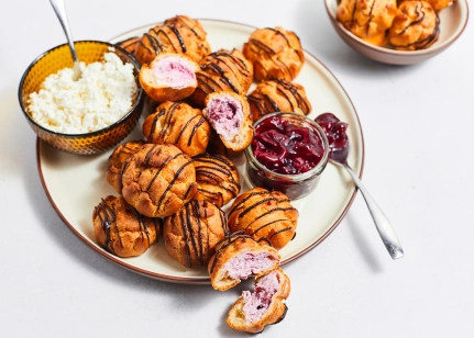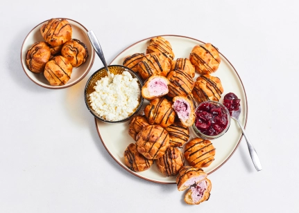 Biezpiena ķiršu krēms (57%)(ķiršu pildījums (41%) ķirši, modificēta kukurūzas ciete, glikozes – fruktozes sīrups, recinātājs E418), biezpiens (23%), saldais krējums, pūdercukurs, cukurs, vaniļas cukurs (pūdercukurs, vaniļa, kartupeļu ciete, aromatizētājs)), plaucētā mīkla (olu masa, kviešu milti, , sāls), glazūra (cukurs, augu tauki (palmu, basijas kodolu), kakao pulveris, vājpiena pulveris, emulgators saulespuķu lecitīns, aromatizētājs)