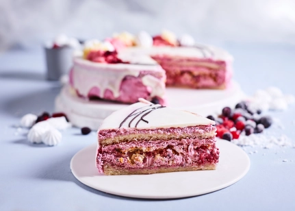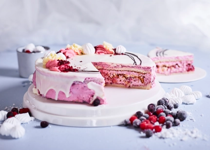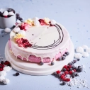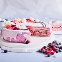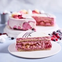 Olas, mascarpone siers, šokolādes glazūra un šokolādes dekori (cukurs, palmu tauki (RSPO MB), rapšu eļļa, vājpiena pulveris, glikozes sīrups, kakao sviests, emulgatori E472a, saulespuķu lecitīns, aromatizētājs, pilnpiena pulveris, laktoze, emulgators sojas lecitīns, dabīgs vaniļas aromatizētājs, kakao pulveris), ogu maisījums (upenes, jāņogas, zemenes, ķirši, mellenes, avenes), cukurs, saldais krējums, avenes, kviešu milti, griljāža (glikozes sīrups, cukurs, dekstroze, medus pulveris, palmu tauki, maltodekstrīns, sviesta eļļa), putukrējuma stabilizators (glikozes sīrups, želatīns, vājpiena pulveris, ciete, aromatizētājs), kokosriekstu skaidiņas, zemesriekstu skaidiņas, kartupeļu ciete, žāvēti ķirši