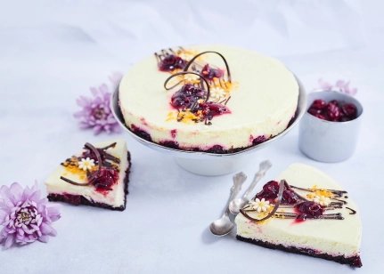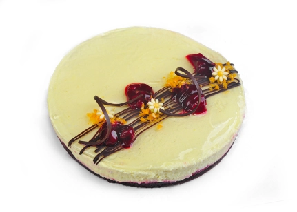 Ķiršu pildījums (16 %)(ķirši, cukurs, pārveidota ciete, biezinātājs E418, glikozes – fruktozes sīrups, skābuma regulētājs citronskābe), biskvīta maisījums (cukurs, kviešu milti, kakao pulveris, rapšu eļļa, sāls, olu baltuma pulveris, aromatizētājs, emulgatori E472b, E471), biezpiens (14 %), saldais krējums, dekorželeja (glikozes sīrups, cukurs, biezinātāji agars, pektīns, E450, skābuma regulētāji citronskābe, trinātrija citrāts), putukrējuma stabilizators (želatīns, ciete, aromatizētājs, citronu sula, krāsvielas riboflavīni, kartupeļu ciete), pūdercukurs, olas, rapšu eļļa, šokolādes glazūra (augu tauki (palmu eļļa, basijas kodolu eļļa), kakao pulveris), šokolādes dekori (kakao masa, kakao sviests, sviesta eļļa, emulgators sojas lecitīns, dabīgs vaniļas aromatizētājs, pilnpiena pulveris, laktoze, vājpiena pulveris, spirulīnas ekstrakts, krāsviela E171, safloras koncentrāts, burkānu ekstrakts), mandarīni/apelsīni kaltēti