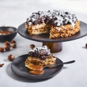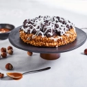 Biskvīts, griljāža, karameļu krēms, virsmai - lazdu rieksti šokolādē.