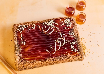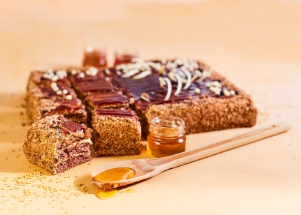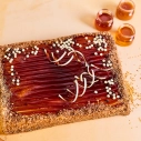 Medus, biskvīts, skābā krējuma krēms, dekorželeja.