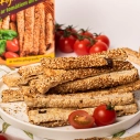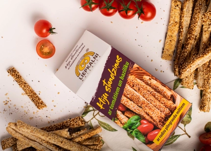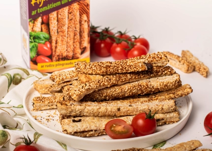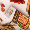 Kviešu milti, margarīns (augu tauki (palmu eļļa), augu eļļa (rapšu eļļa), emulgatori E471, saulespuķu lecitīns, skābuma regulētājs citronskābe, dabīgs aromatizētājs, krāsviela beta karotīns), sezama sēklas, rudzu pilngraudu milti, olu masa, kaltēti tomāti saulespuķu eļļā (3%), rudzu rīvmaize (rudzu milti, kviešu milti, cukurs, rudzu iesals, sāls, kviešu klijas, raugs, miežu iesala ekstrakts, ķimenes), kviešu klijas (1%), malta asā paprika, baziliks (0.4%), sāls, timiāns, skābuma regulētājs citronskābe