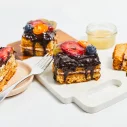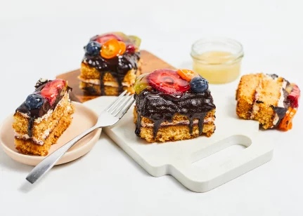 Augļi (zemenes, mellenes, jāņogas), glazūra (augu tauki (palmu, basijas kodolu), kakao pulveris, vājpiena pulveris, emulgators saulespuķu lecitīns, aromatizētājs), kviešu milti, skābais krējums, cukurs, dzērveņu ievārījums (dzērvenes, glikozes-fruktozes sīrups, biezinātājs pektīns), olu masa, saldais krējums, medus (5%), irdinātājs dzeramā soda