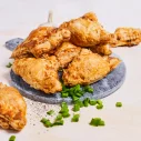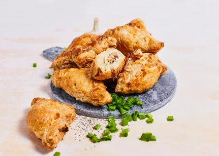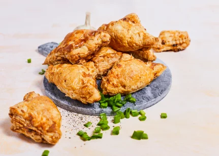 Kārtainās mīklas pīrādziņš, pildījumā maltā vistas gaļa. Labi garšos kopā ar dažāda veida buljonu.